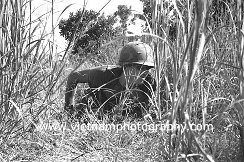 | A soldiers from Bravo Co., 4th Battalion, 31st Infantry Regiment, 196th Light Infantry Brigade, Americal Division, looks for the enemy during a firefight in the Hiep Duc Valley, 35 miles south of Danang. The valley was the site of some of the fiercest fighting of the war between Americans and North Vietnamese Army (NVA) regulars.
