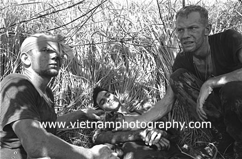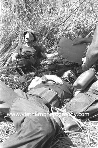 | Wounded soldiers from Bravo Co., 4th Battalion, 31st Infantry Regiment, 196th Light Infantry Brigade, Americal Division, wait for Medevac choppers at the company command post during a firefight in the Hiep Duc Valley, 35 miles south of Danang. The valley was the site of some of the fiercest fighting of the war between Americans and North Vietnamese Army (NVA) regulars.