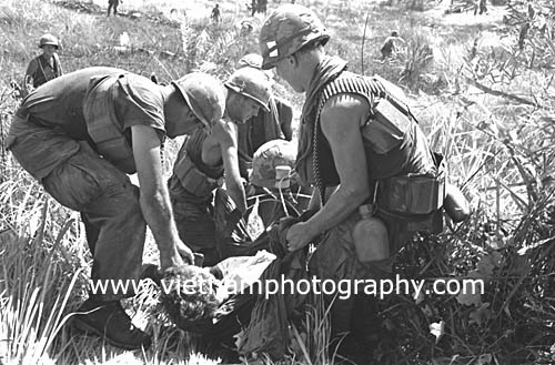 | Soldiers from Bravo Co., 4th Battalion, 31st Infantry Regiment, 196th Light Infantry Brigade, Americal Division, carrying a wounded buddy during a firefight in the Hiep Duc Valley, 35 miles south of Danang. The valley was the site of some of the fiercest fighting of the war between Americans and North Vietnamese Army (NVA) regulars.