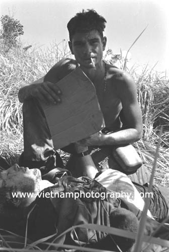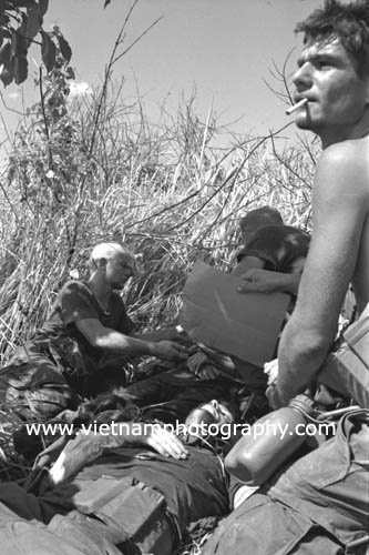 | Frank Eates fans Pfc. James A. Doughty, 20, of Chelmsford, Mass. Doughty was mortally wounded during intense fighting in the Hiep Duc Vally, 35 miles south of Danang. The men were members of Bravo Co., 4th Battalion, 31st Infantry Regiment, 196th Light Infantry Brigade, Americal Division. The fighting in the Hiep Duc Valley was the site of some of the fiercest fighting of the war between Americans and North Vietnamese Army (NVA) regulars.