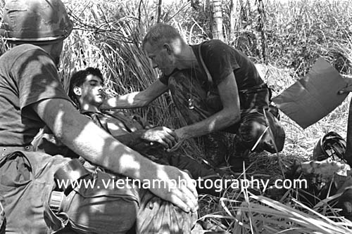 | A medic treats a wounded soldier from Bravo Co., 4th Battalion, 31st Infantry Regiment, 196th Light Infantry Brigade, Americal Division. The man was hit during a firefight in the Hiep Duc Valley, 35 miles south of Danang. The valley was the site of some of the fiercest fighting of the war between Americans and North Vietnamese Army (NVA) regulars.