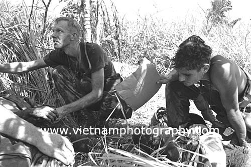 | Frank Eates fans a mortally wounded Pfc. James A. Doughty, 20, of Chelmsford, Mass. Doughty was wounded during intense fighting in the Hiep Duc Vally, 35 miles south of Danang. The men were members of Bravo Co., 4th Battalion, 31st Infantry Regiment, 196th Light Infantry Brigade, Americal Division. The fighting in the Hiep Duc Valley was the site of some of the fiercest fighting of the war between Americans and North Vietnamese Army (NVA) regulars.