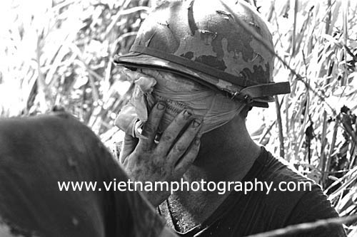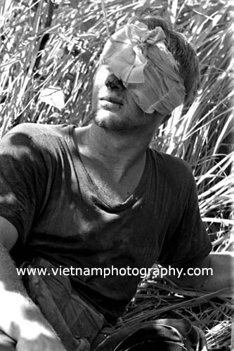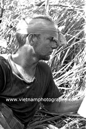 | A soldier, wounded in the face, waits for a Medvac chopper. He was wounded during a firefight in the Hiep Duc Valley, 35 miles south of Danang. The valley was the site of some of the fiercest fighting of the war between Americans and North Vietnamese Army (NVA) regulars. He was part of Bravo Co., 4th Battalion, 31st Infantry Regiment, 196th Light Infantry Brigade, Americal Division.