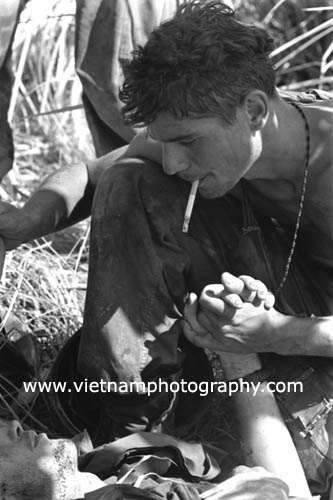 | Frank Eates comforts Pfc. James A. Doughty, 20, of Chelmsford, Mass. Doughty died moments later. He had been hit during intense fighting in the Hiep Duc Vally, 35 miles south of Danang. The men were members of Bravo Co., 4th Battalion, 31st Infantry Regiment, 196th Light Infantry Brigade, Americal Division. The fighting in the Hiep Duc Valley was the site of some of the fiercest fighting of the war between Americans and North Vietnamese Army (NVA) regulars.