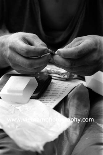 | A soldier fumbles with his P-79 C ration can opener during a breather in fighting in the Hiep Duc Valley, 35 miles south of Danang. The man was from Bravo Co., 4th Battalion, 31st Infantry Regiment, 196th Light Infantry Brigade, Americal Division. The battle was some of the fiercest fighting of the war between Americans and North Vietnamese Army (NVA) regulars.