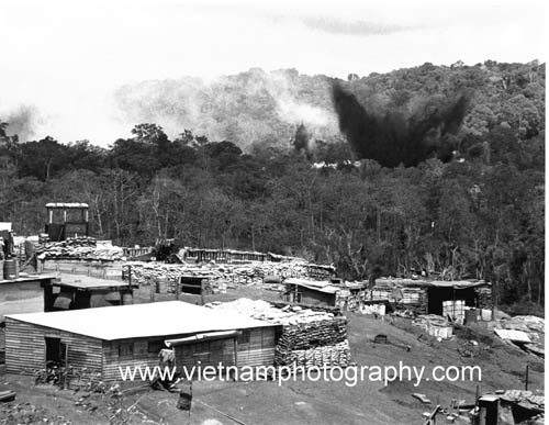 | American artillery explodes just outside the wire at Duc Lap Special Forces camp two miles from the Cambodian border in Quang Duc Province in II Corps in November 1969. The camp was manned by U.S. Special Forces from team A-239 and soldiers from Battery D, 5th Battalion, 22nd Field Artillery Regiment. |