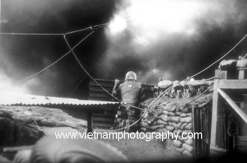 | The Special Forces commander at Ben Het watches as his ammunition dump explodes after being hit by North Vietnam Army artillery. The base was under siege by NVA troops who rained artillery, rockets and mortars on the camp near the Laotian border during a month-long siege. |