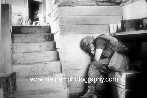 | The Special Forces commander at Ben Het waits out a North Vietnamese Army artillery barrage during a month-long siege at the camp near the Laotian border. |