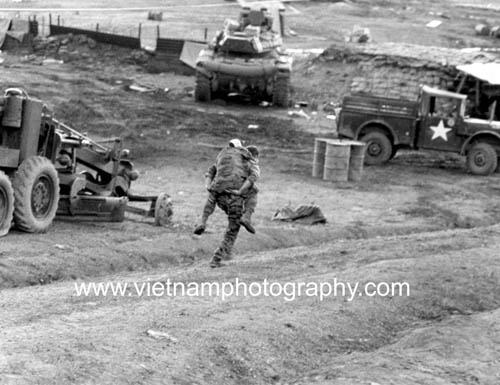 | A Green Beret carries a wounded Vietnamese soldier to the medical bunker during a North Vietnamese Army artillery barrage at the besieged camp near the Laotian border. |