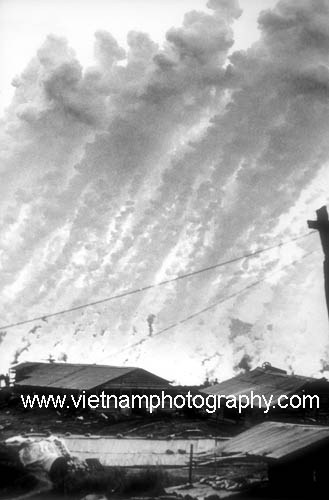 | A smoke screen helped troops at Ben Het Special Forces camp recover air-dropped supplies. The camp was shelled daily by the North Vietnamese army during a month-long siege. |