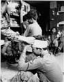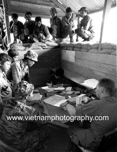 | A Green Beret pays Montagnard mercenaries who helped defend the Ben Het Special Forces camp near the Laotian border during a month-long siege by the North Vietnamese Army. |