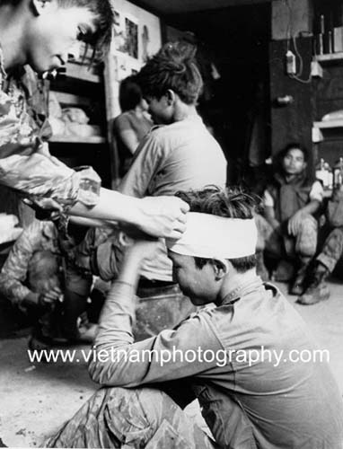 | A South Vietnamese army medic treats a wounded comrade in the medical bunker at Ben Het Special Forces camp near the Laotian border during a month-long siege by the North Vietnamese Army. |