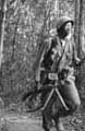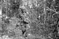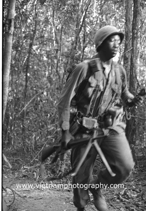 | A radio operator (RTO) runs down a jungle trail in Vietnam's central highlands during a 1967 firefight.