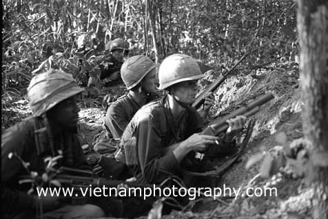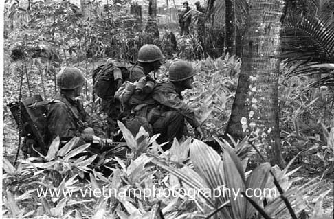 | Troops take break in dense, triple-canopy jungle in Vietnam's central highlands in 1967.