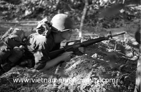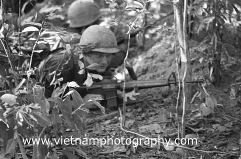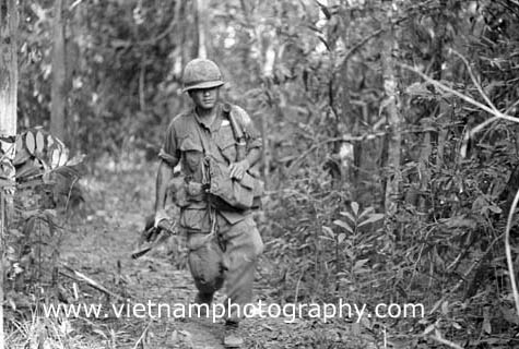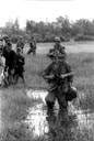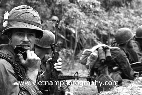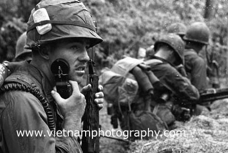 | Troops move through the jungle in Vietnam central highlands in 1967. The man in the foreground is a radio operator, an RTO.