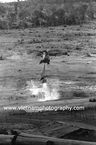 | A CH-47 Chinook helicopter delivers a sling load of cargo to Duc Lap Special Forces camp two miles from the Cambodian border in Quang Duc Province in II Corps in November 1969. The camp was manned by Nung mercenaries, U.S. Special Forces from team A-239 and soldiers from Battery D, 5th Battalion, 22nd Field Artillery Regiment. It was under steady fire from North Vietnamese Army (NVA) rockets and artillery.